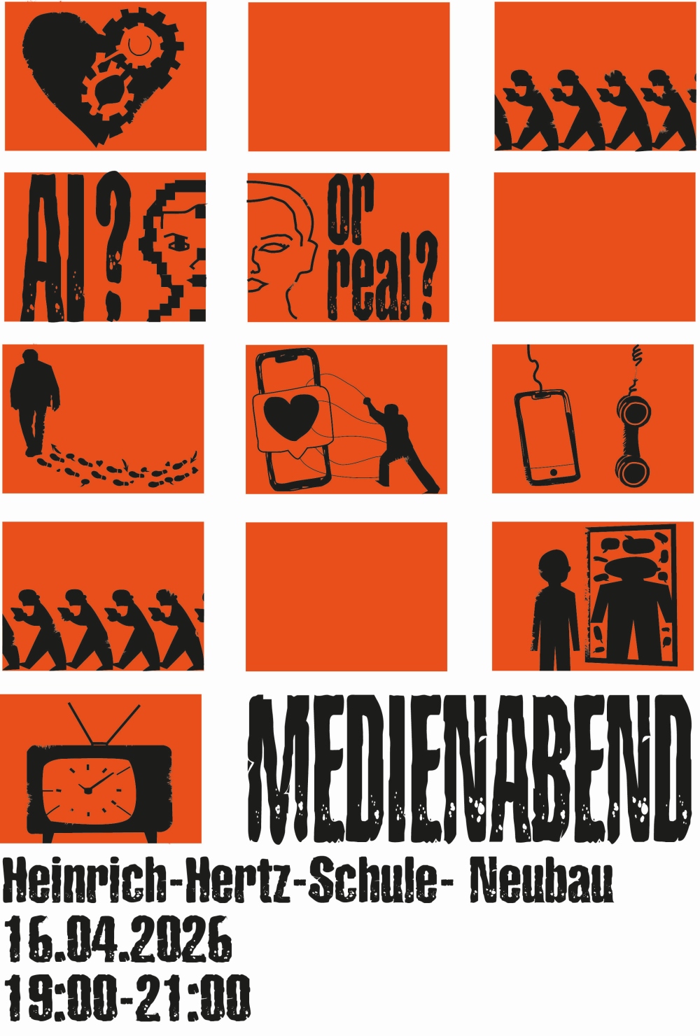 Der Countdown für den Medienabend 2026 läuft: Das S2-Medienprofil lädt für Donnerstag, 16.4.2026 um 19 Uhr in den HHS-Neubau ein. Die Projekträume Fake or Real, Likes for Life, Back to Analogue, Dating, Body Dysmorphia, TV in time-lapse/ Live in a Frame und Digital Footprint setzen sich kreativ mit den aktuellen Entwicklungen rund um die digitale Transformation und unserer vielfältigen Medienwelt auseinander und bieten auch Anlässe für Diskussionen. Mit dabei sein wird auch wieder die Fachhochschule Wedel (Prof. Dr. Hendrik Annuth: "Lernen mit und über KI") sowie die HHS-AG "Stark im Netz", die unterstützen will, "Medien reflektiert, verantwortungsbewusst und selbstbestimmt zu nutzen".