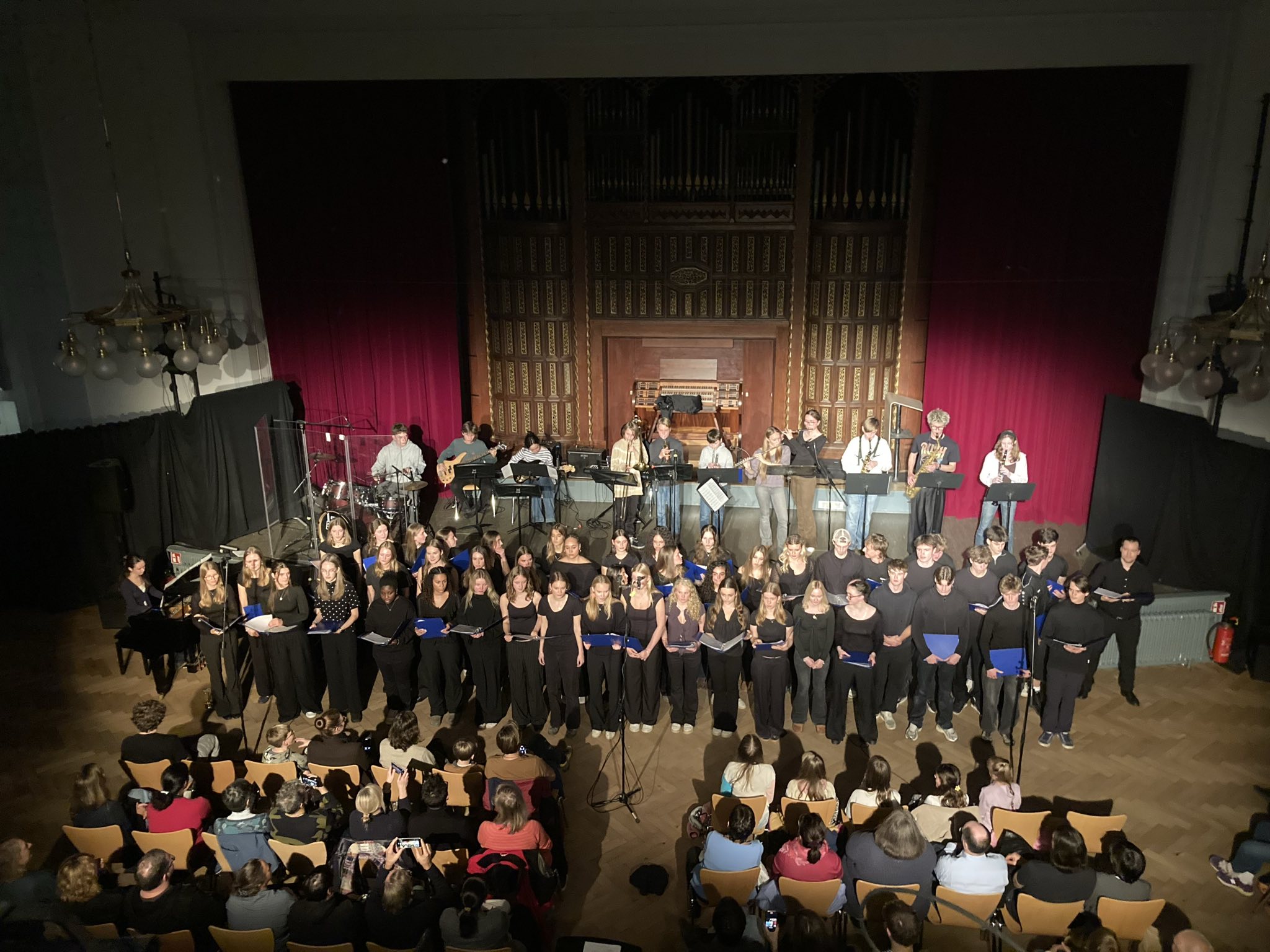 14.11.2025 Vom 3.-5.11. waren 73 Schülerinnen und Schüler in Scharbeutz, um eine neue Tradition zu begründen - die Probenfahrt des Oberstufenchors und der Big Band. In 3 intensiven Tagen, die aus viel Probenarbeit, aber auch Lernphasen, Fußballspielen, einer Klausur und Pubquiz bestanden, wurde ein Konzert für den 6.11. vorbereitet. Nach der Rückkehr am Mittwoch und dem Vorabitur für viele Schülerinnen und Schüler am Donnerstag Vormittag wurde in der heimischen Aula C am Donnerstag ein Abschlusskonzert präsentiert, in dem beide Ensembles mit 7 Stücken das Publikum begeisterten. Viel positives Feedback vom Publikum und eine gute Stimmung sowohl in Scharbeutz als auch beim Konzert waren der verdiente Lohn für diese intensive Woche. Wir freuen uns schon auf das nächste Jahr!